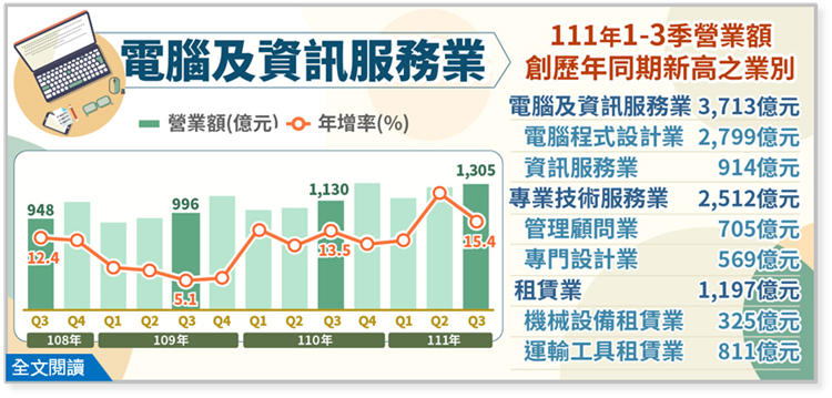 1.111年第3季電腦及資訊服務業營業額1,305億元,為歷年同季新高,年增15.4%,其中電腦程式設計業984億元,年增15.8%,主因資訊系統整合服務、網路數據交換應用需求升高,以及遊戲軟體設計業績提升所致;資訊服務業321億元,年增14.2%,主因拍賣平台網站管理業者拓展服務據點及推出促銷活動,帶動抽成營收成長,加以雲端電腦資料保管等業績攀升所致。